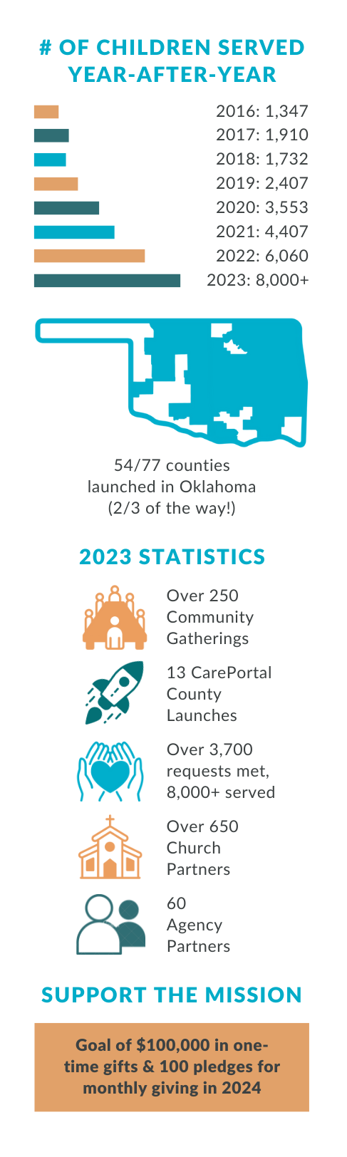 Would you consider a year-end gift to the 111Project or even becoming a monthly recurring partner in 2024 to help mobilize local churches and ensure every child has a family? We believe that $100,000 in year-end one-time gifts AND 100 new monthly commitments will propel us down the road to 77 so that we can reach our goal of partnering with 1,000 churches across all 77 counties so that every child in Oklahoma has family.